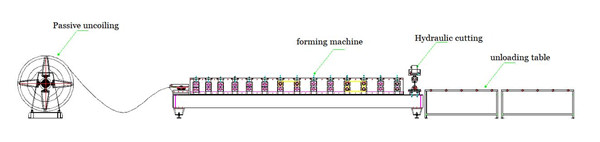 The main machine is composed of passive uncoiler, Roll forming (including feeding, hydraulic cutting and unloading table), hydraulic system, electric control system, etc.